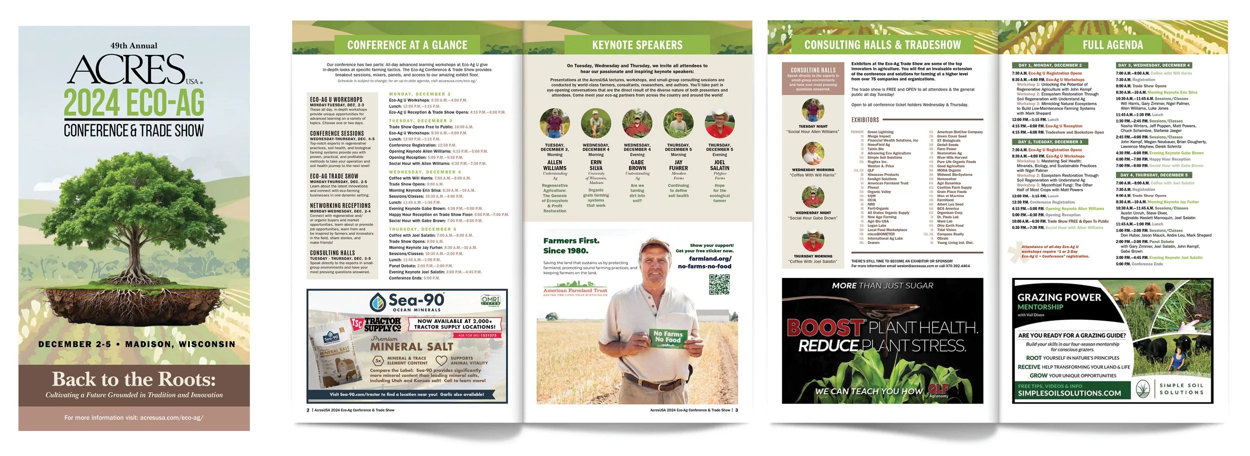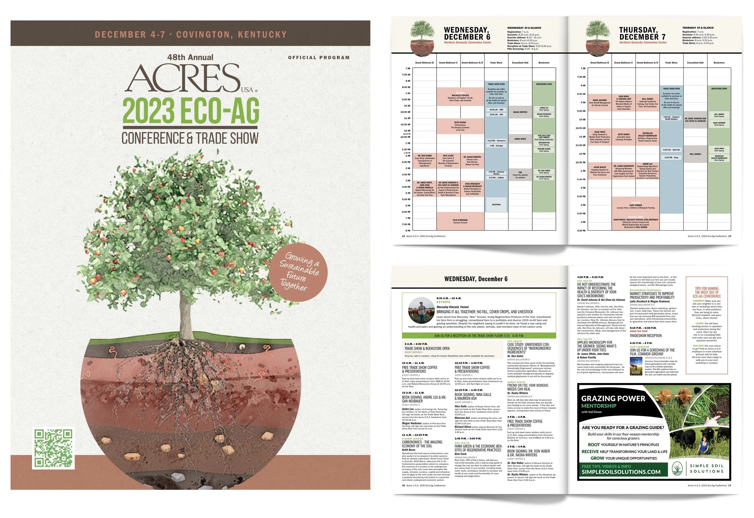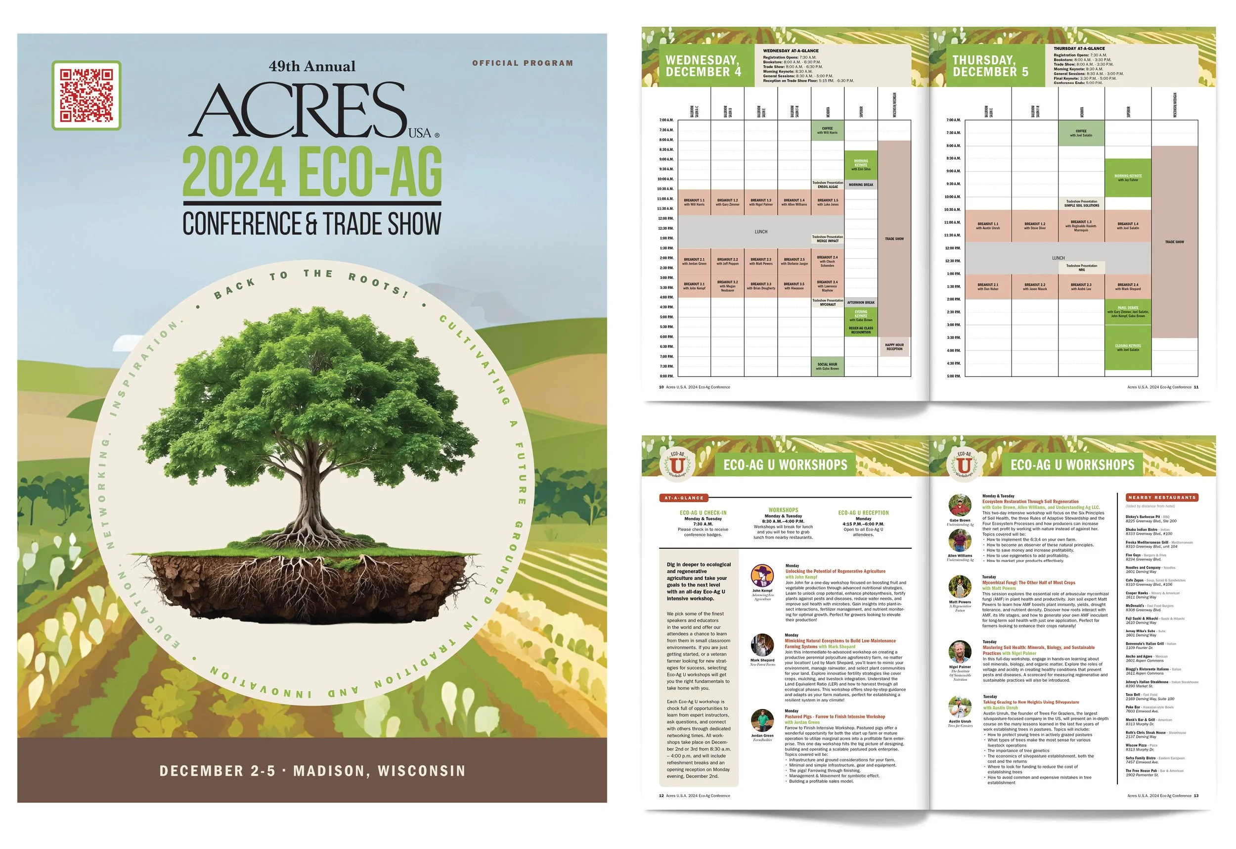 ACRES hosts one of the premier conferences for ecological agriculture every year. An educational and interactive forum to learn about the newest tech and hear from some of the industry leaders on best practices, this is a crown jewel event. 2023 was the first year I came onboard to design materials, starting with an updated brand package. Each year we build on that branding for a unique look and feel. The two main components are the marketing brochure, which is mailed out a couple months in advance of the conference, and the program which is handed out on-site as the official guide for all of the attendees and vendors.