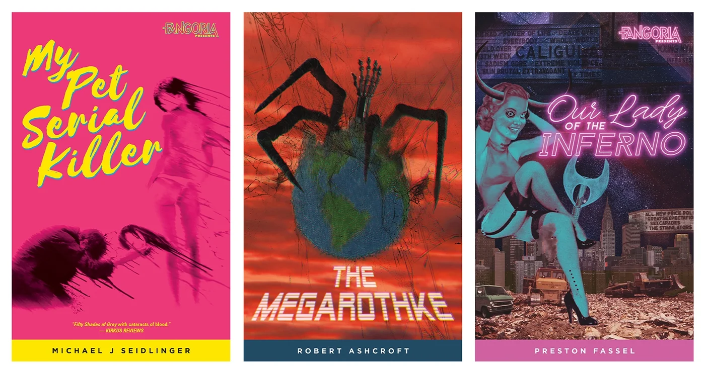 One of the opportunities provided to me while Art Director of FANGORIA / Cinestate was getting to design & illustrate a few fiction book covers. Right are final covers, below are some of the alternate covers from The Megarothke and Our Lady of the Inferno.